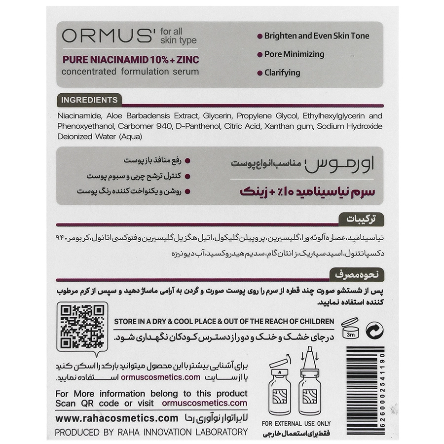استفاده از سرم نیاسینامید و زینک اورموس نه تنها به بهبود رنگ و بافت پوست کمک میکند، بلکه تاثیر مثبتی در کاهش لکها، چین و چروکها و قرمزی پوست دارد. فرمولاسیون ملایم آن فاقد الکل و پارابن است و برای انواع پوست، حتی پوستهای حساس نیز مناسب است. این محصول به لطف ترکیب دقیق و اثربخش خود، یک انتخاب ایده آل برای مراقبت روزانه پوست محسوب میشود و میتواند در روتین پوستی شما نقش کلیدی داشته باشد.